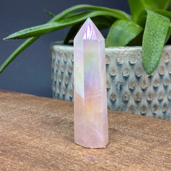 Aura Rose er Rosenkvarts tårne behandlet med varme og metaller der giver det farverige regnbuespil.