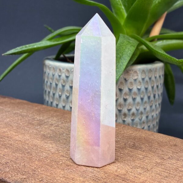 Aura Rose er Rosenkvarts tårne behandlet med varme og metaller der giver det farverige regnbuespil.