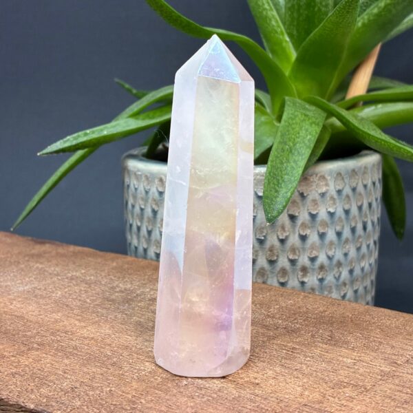 Aura Rose er Rosenkvarts tårne behandlet med varme og metaller der giver det farverige regnbuespil.