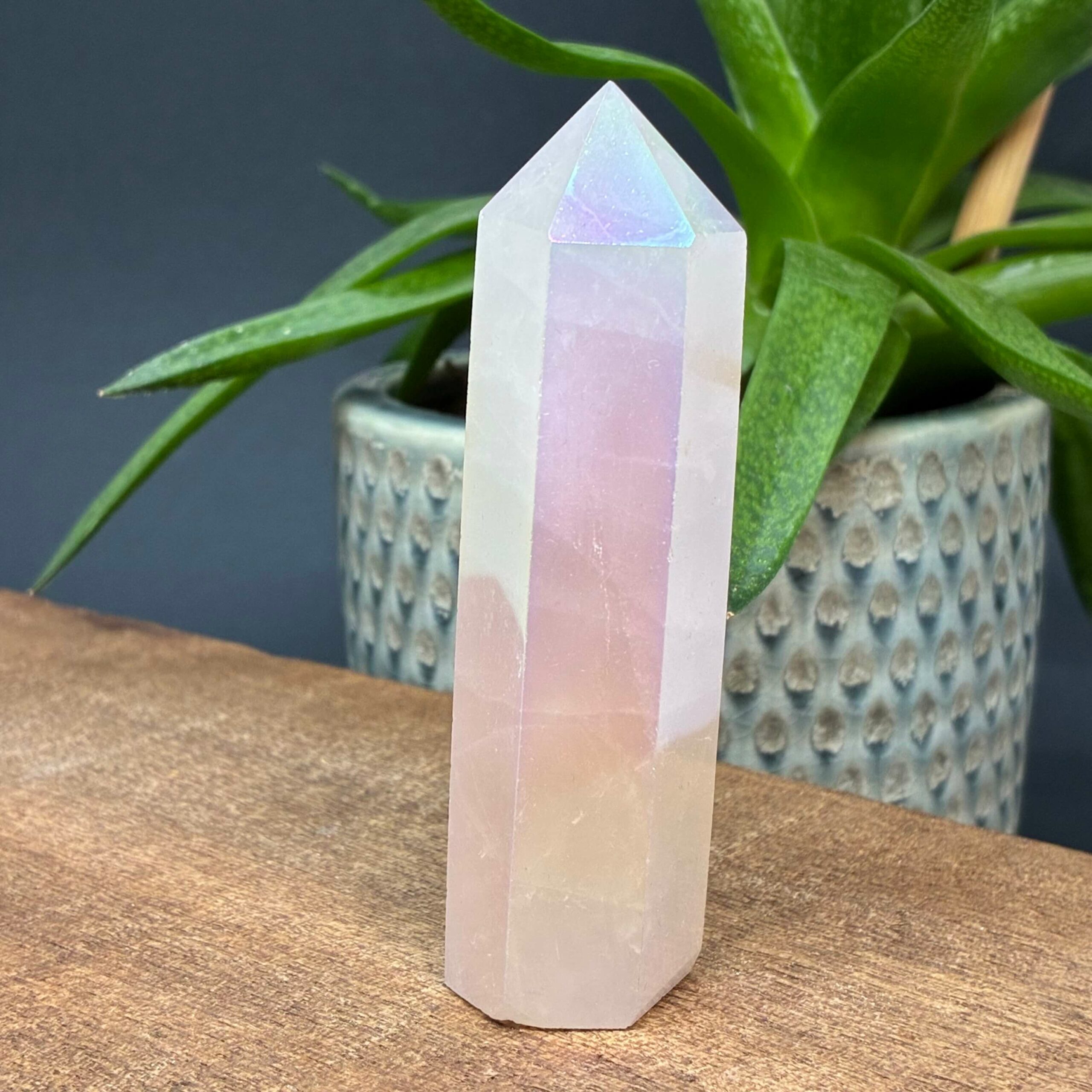 Aura Rose er Rosenkvarts tårne behandlet med varme og metaller der giver det farverige regnbuespil.