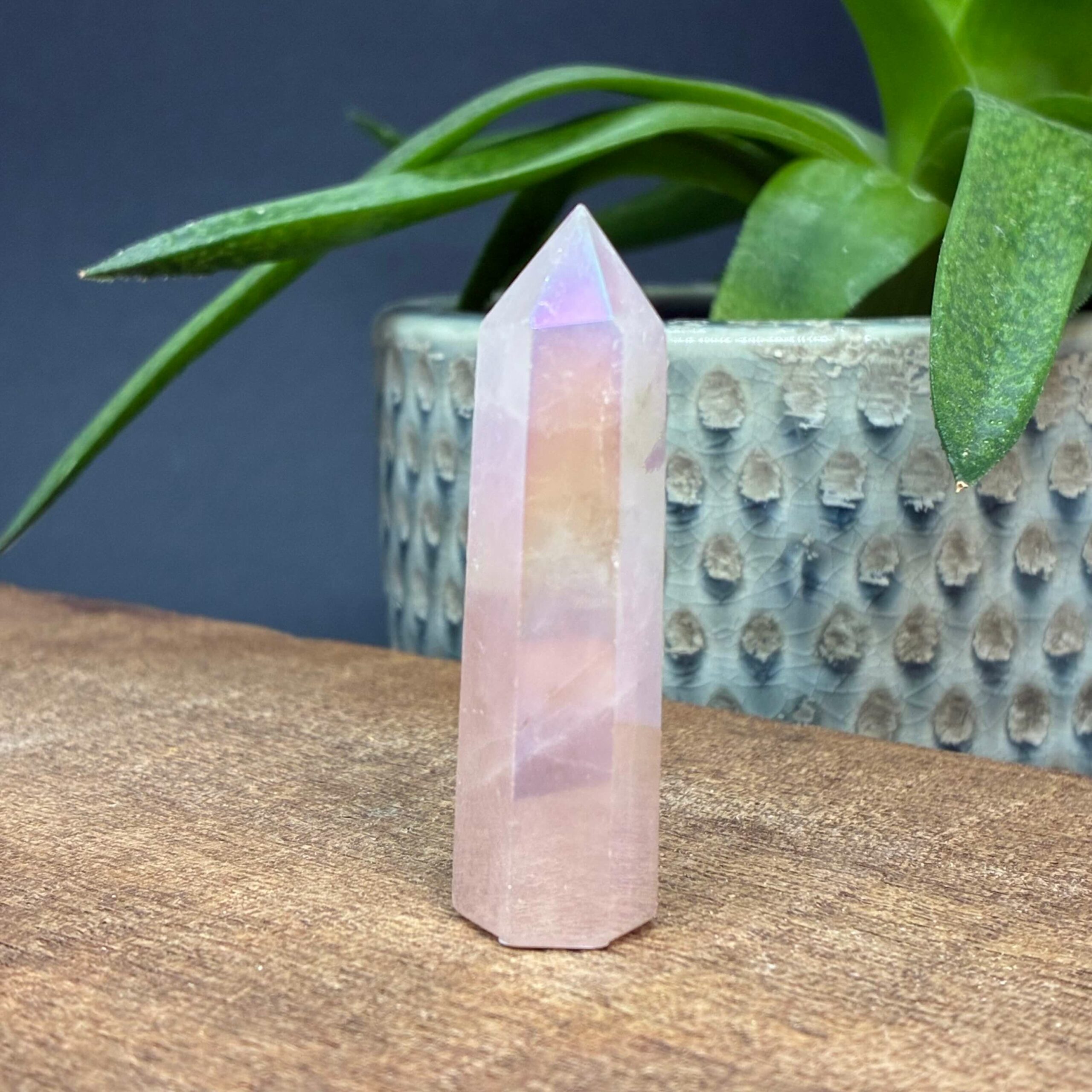 Aura Rose er Rosenkvarts tårne behandlet med varme og metaller der giver det farverige regnbuespil.