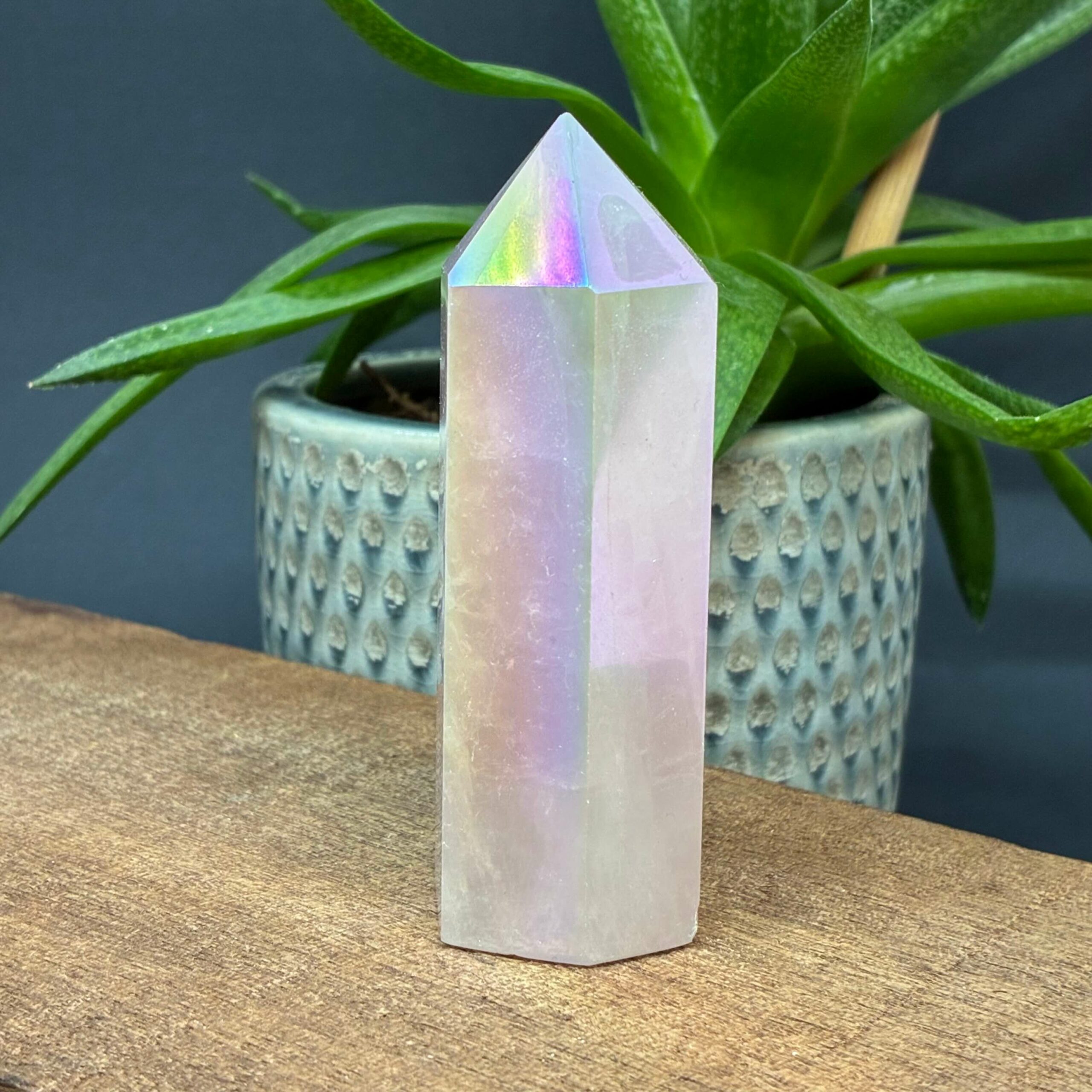 Aura Rose er Rosenkvarts tårne behandlet med varme og metaller der giver det farverige regnbuespil.