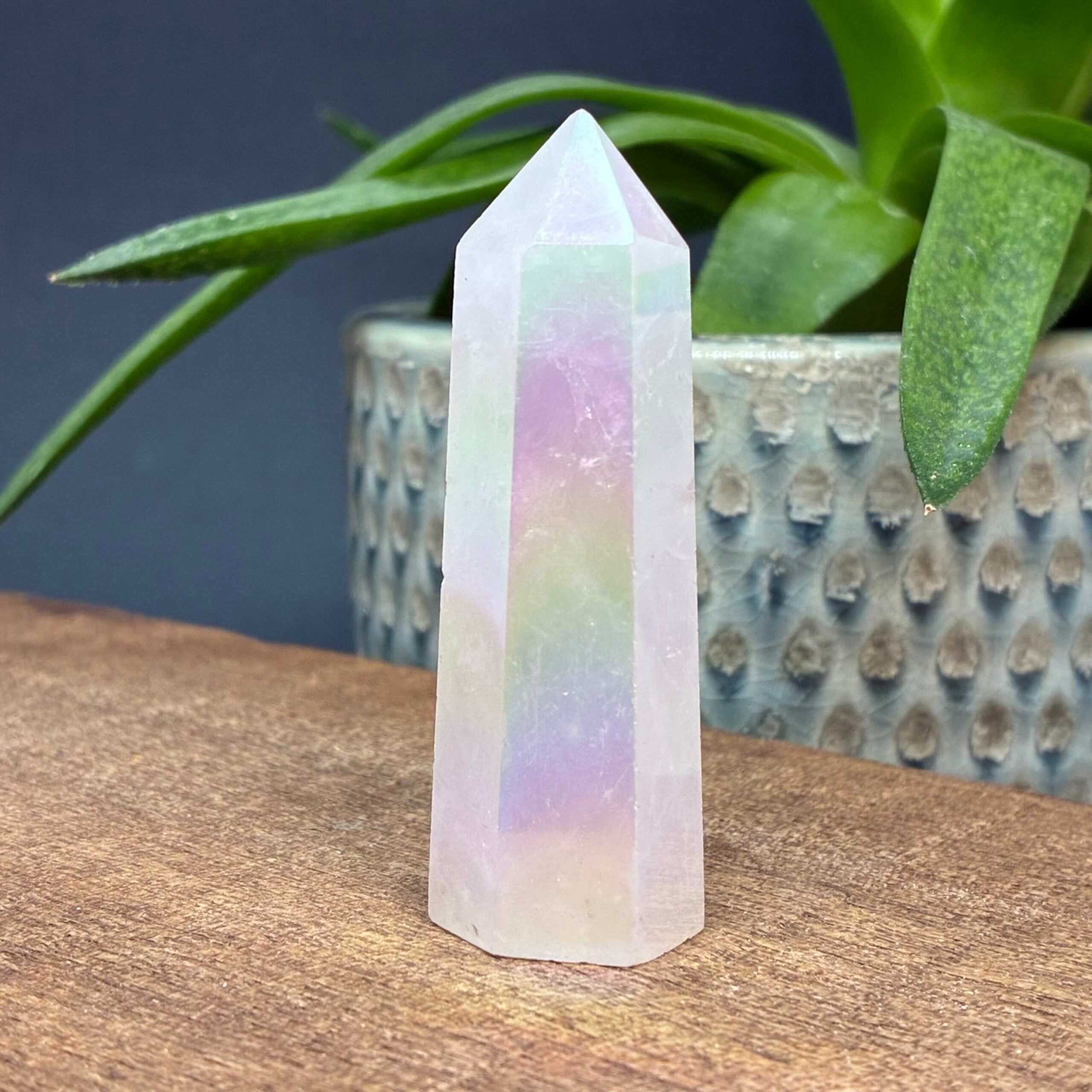 Aura Rose er Rosenkvarts tårne behandlet med varme og metaller der giver det farverige regnbuespil.