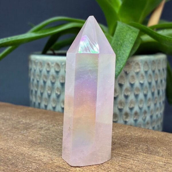 Aura Rose er Rosenkvarts tårne behandlet med varme og metaller der giver det farverige regnbuespil.