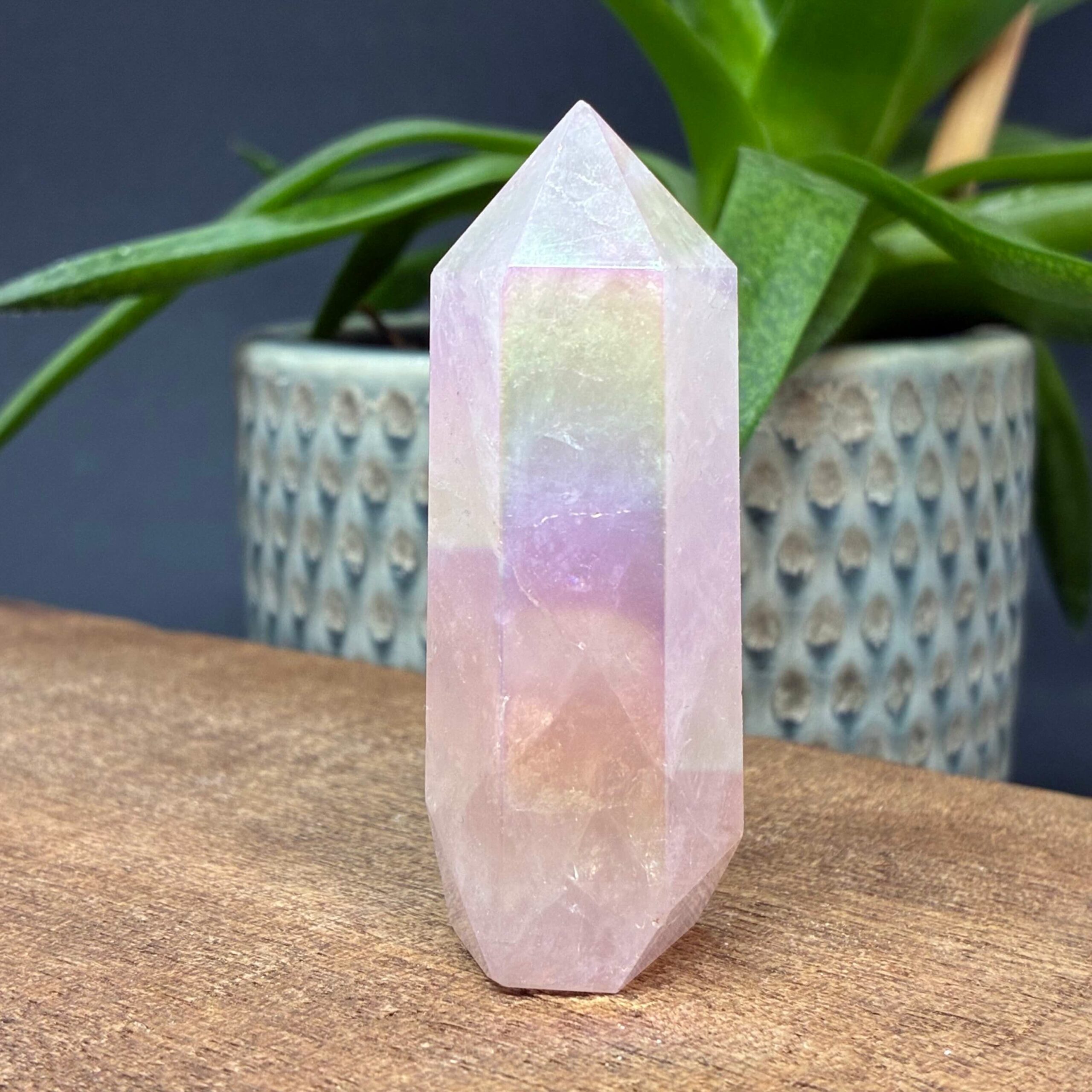 Aura Rose er Rosenkvarts tårne behandlet med varme og metaller der giver det farverige regnbuespil.