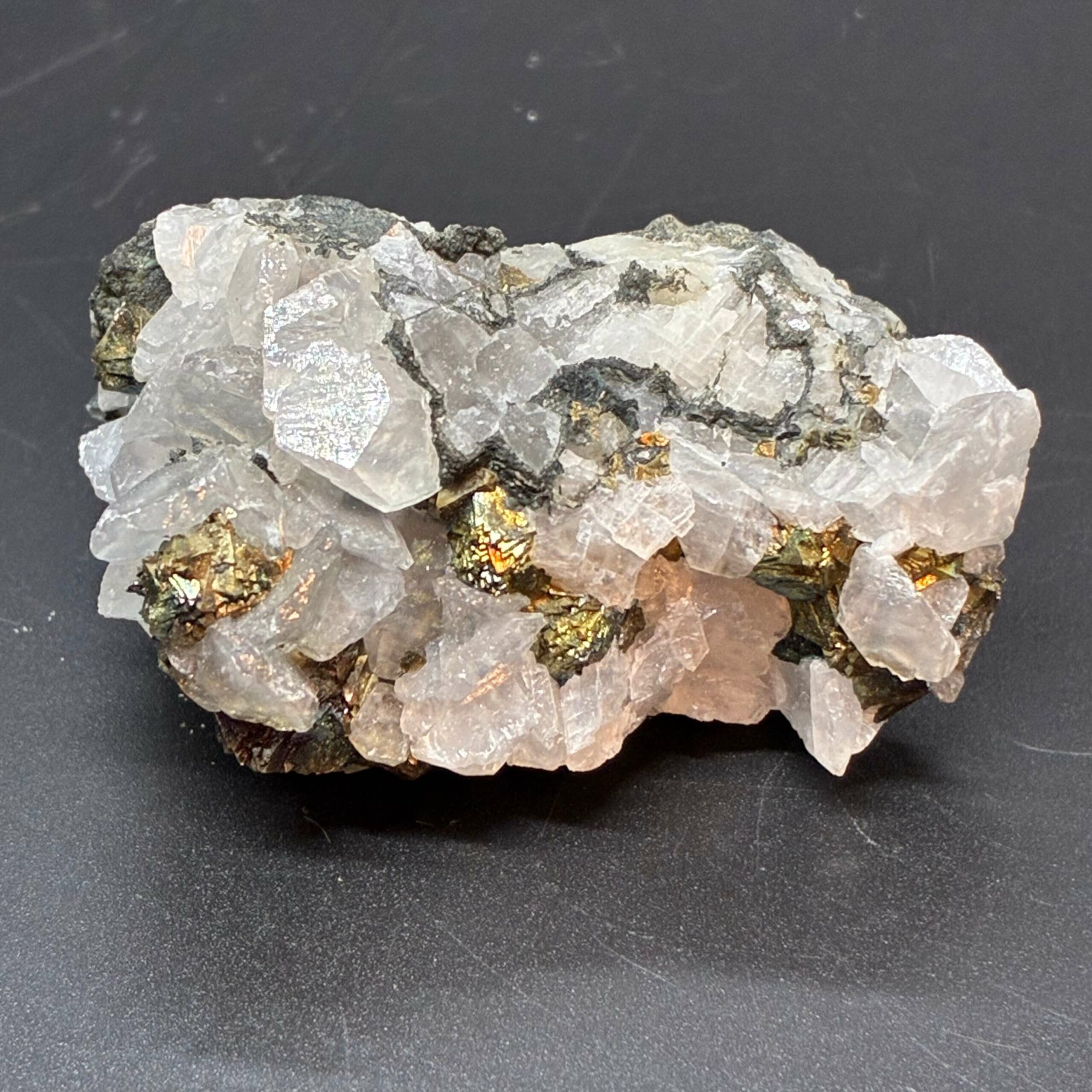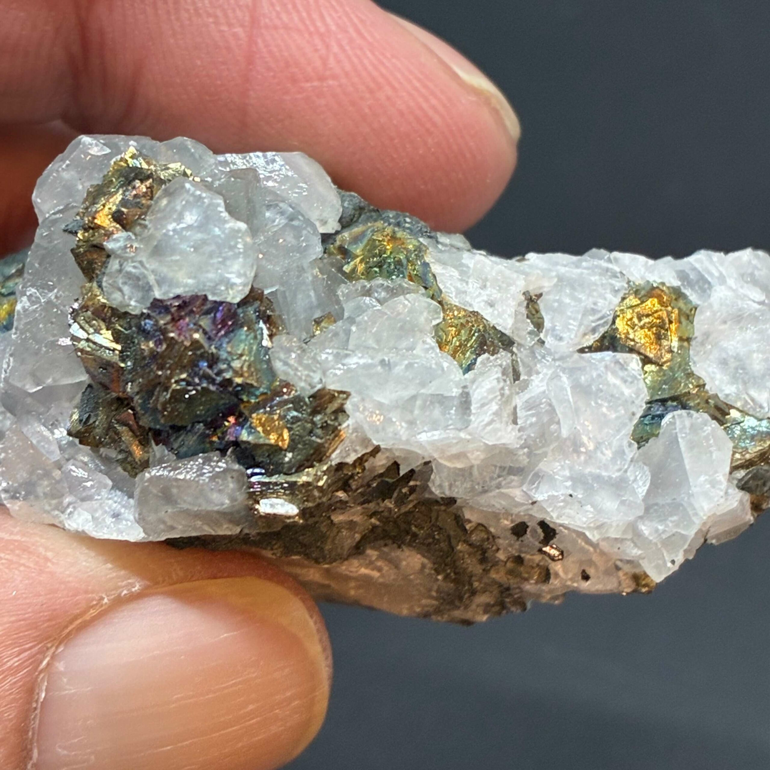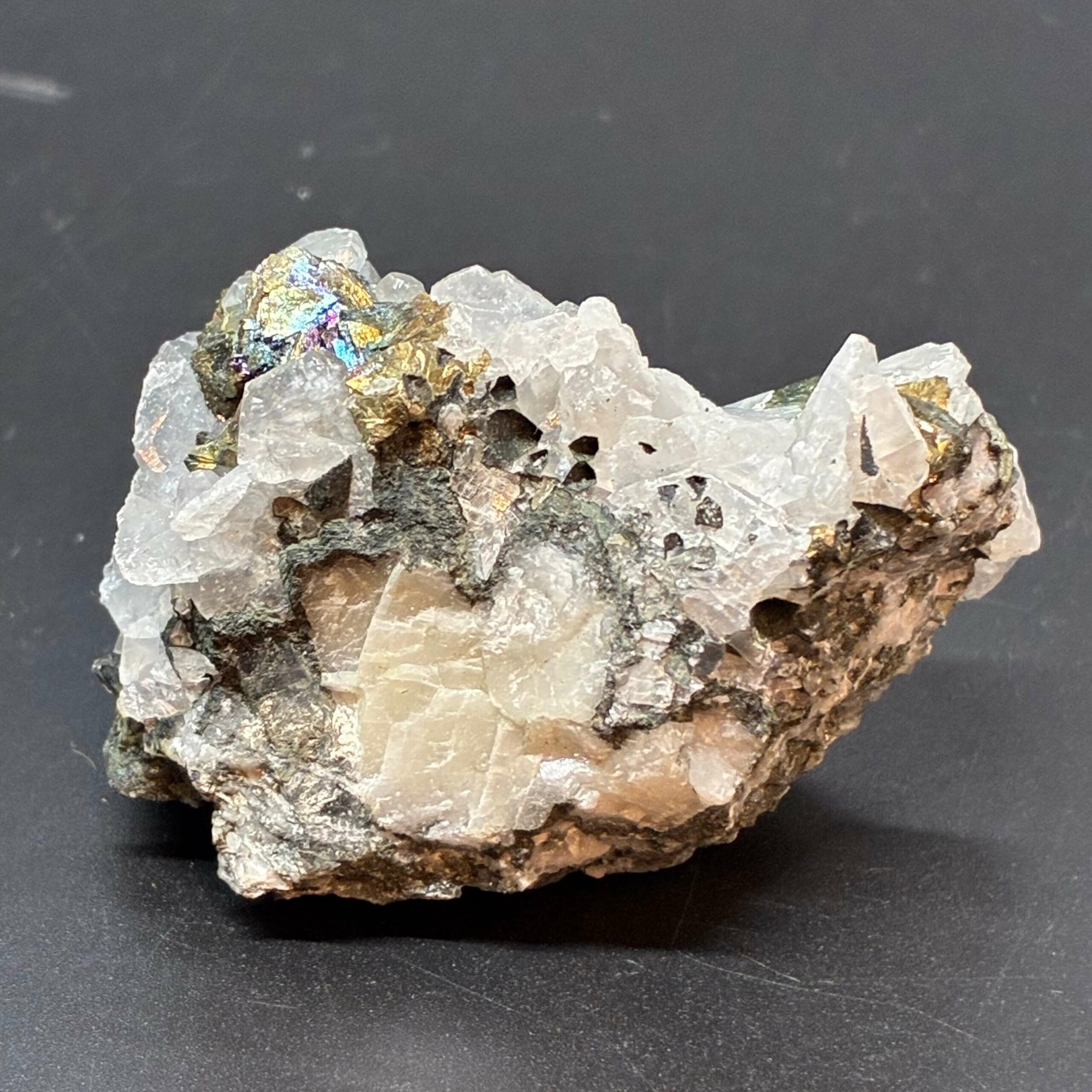 Et lækkert stykke med det regnbue farvestrålende Chalcopyrit groende på et mix af calsit og kvarts.