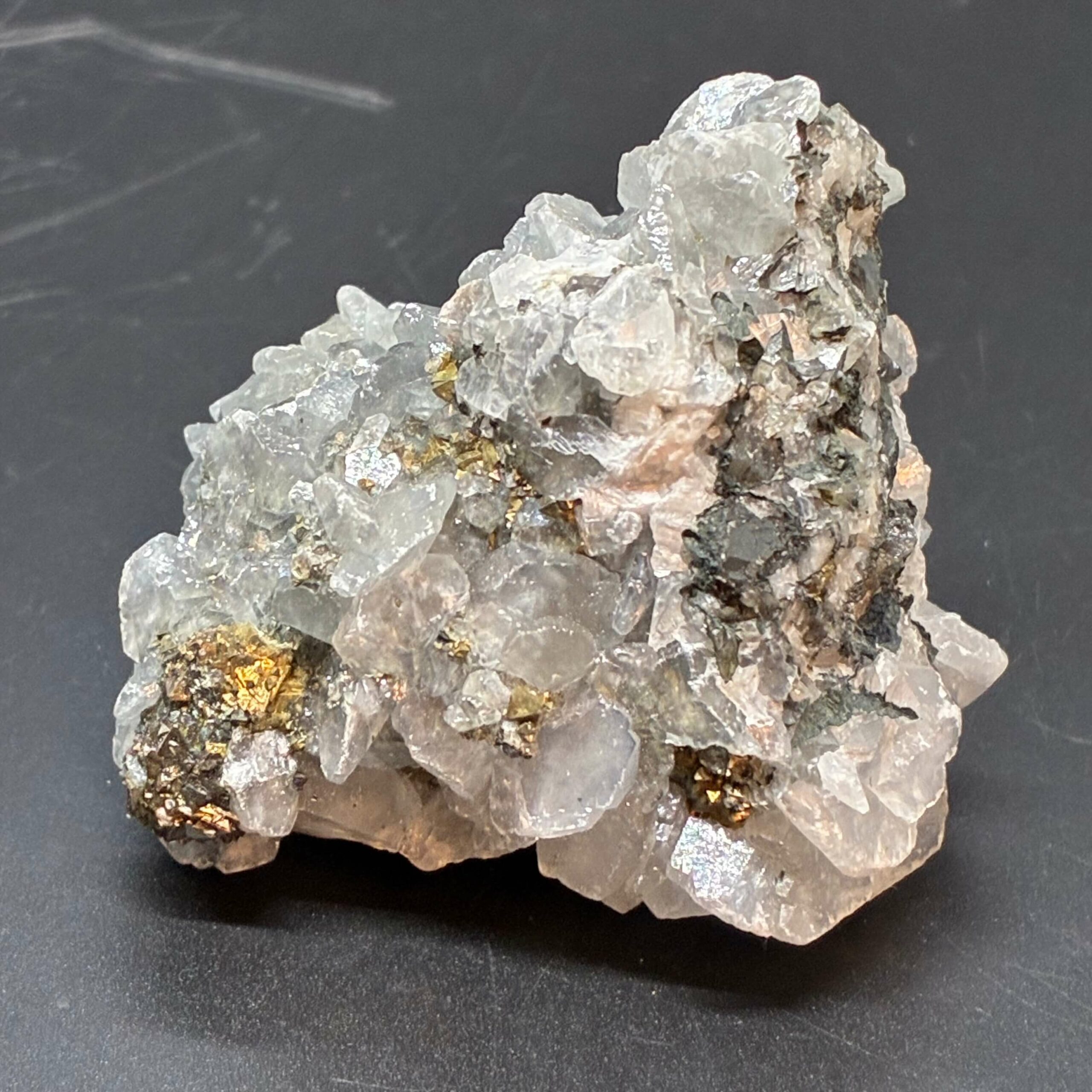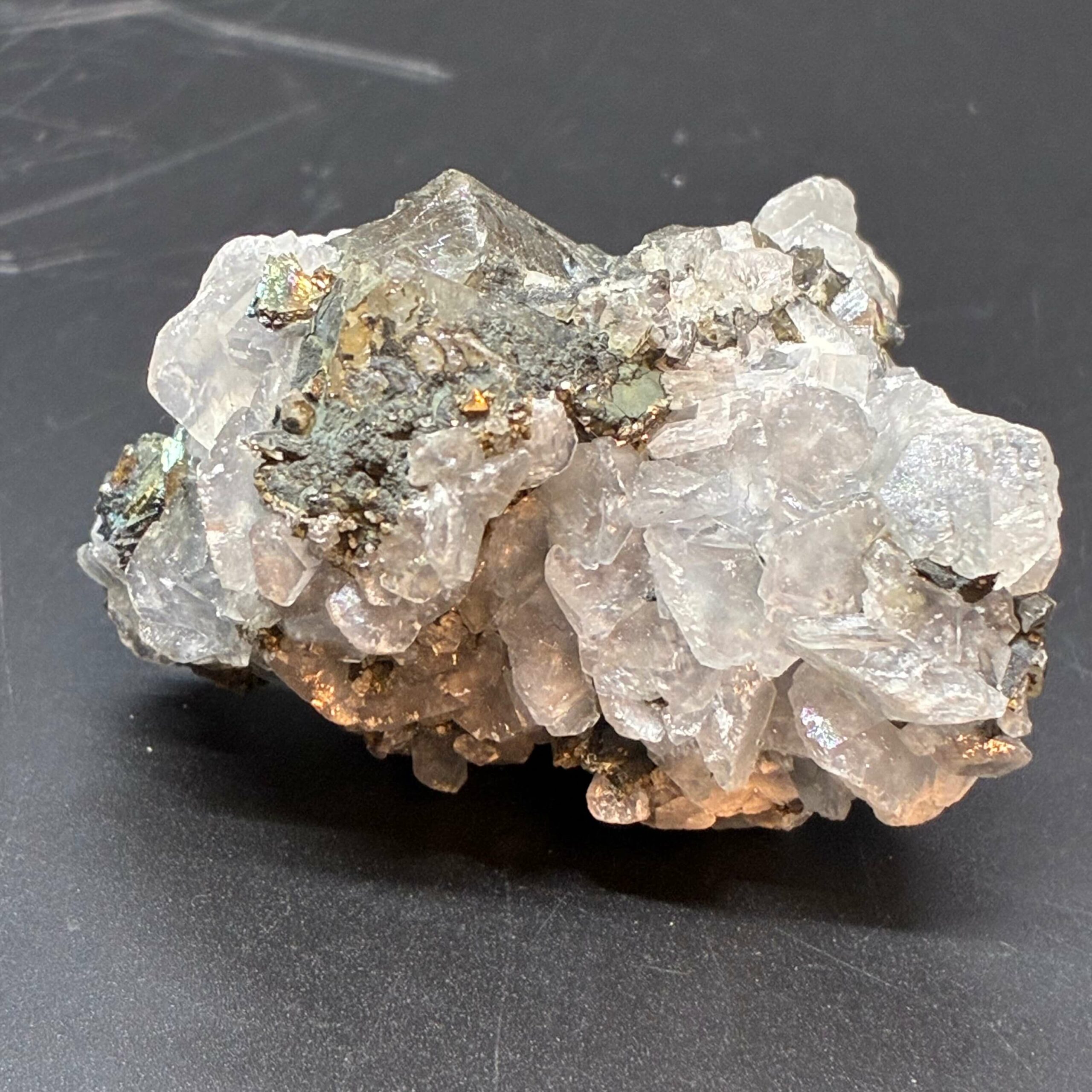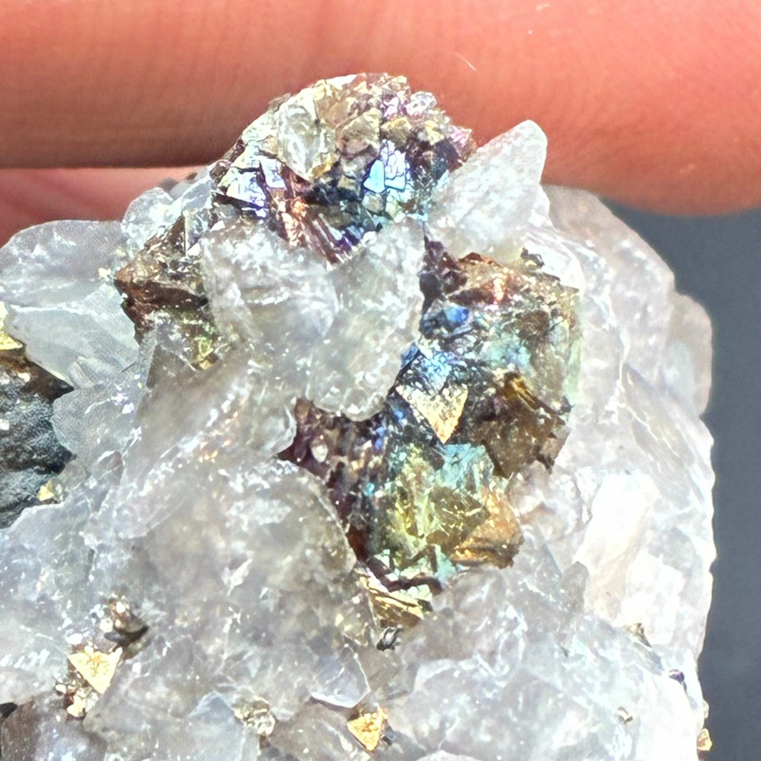 Et lækkert stykke med det regnbue farvestrålende Chalcopyrit groende på et mix af calsit og kvarts.