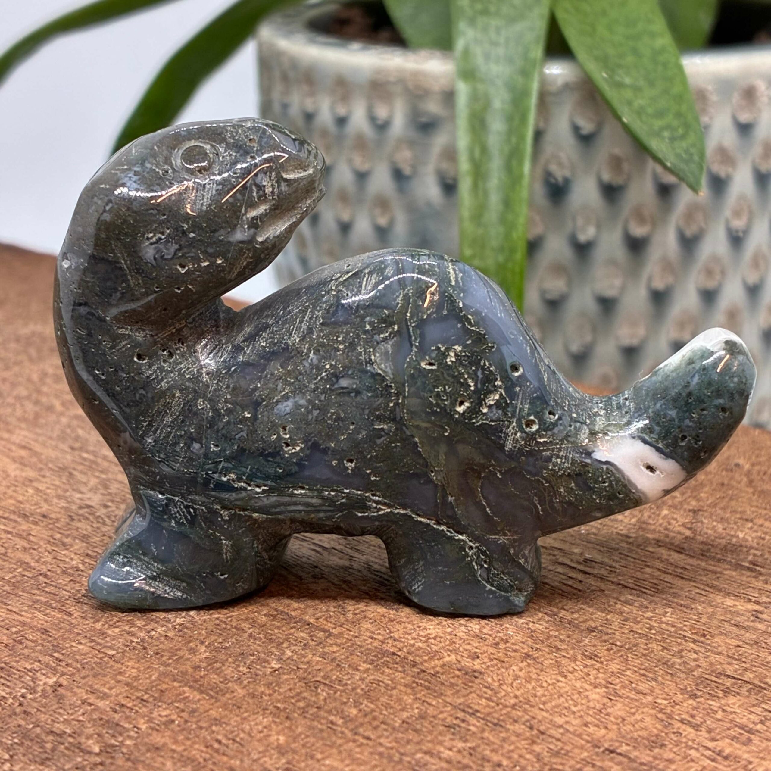 Smuk Dino skåret i Mos Agat, med flotte mosinklutioner.