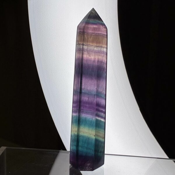 Den smukkeste kvalitet Fluorit med bånd og lækre farvespil. Ser mørk ud men i det rette lys kommer farverne frem.