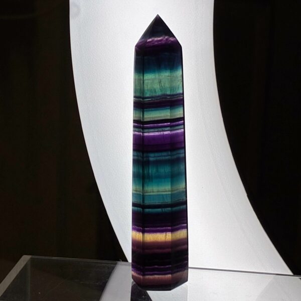 Den smukkeste kvalitet Fluorit med bånd og lækre farvespil. Ser mørk ud men i det rette lys kommer farverne frem.