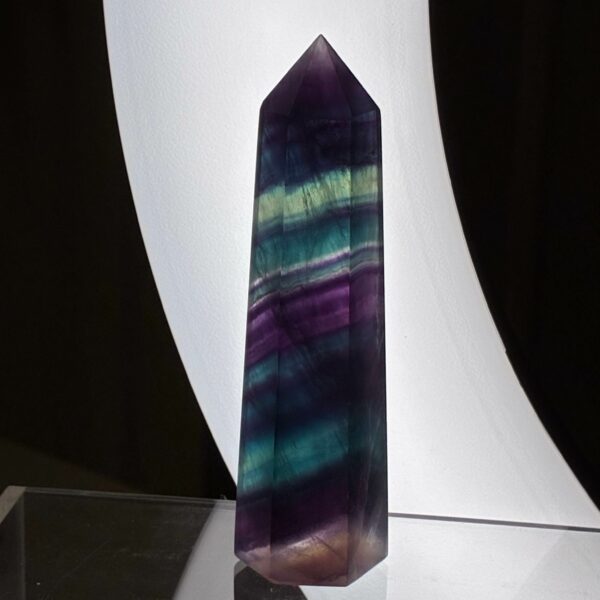 Den smukkeste kvalitet Fluorit med bånd og lækre farvespil. Ser mørk ud men i det rette lys kommer farverne frem.