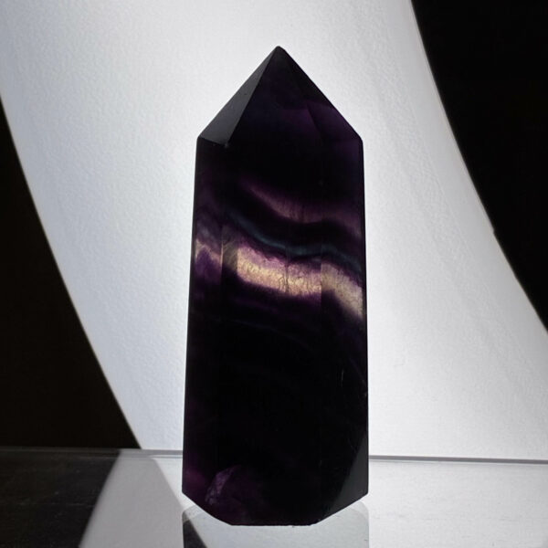Den smukkeste kvalitet Fluorit med bånd og lækre farvespil. Ser mørk ud men i det rette lys kommer farverne frem.