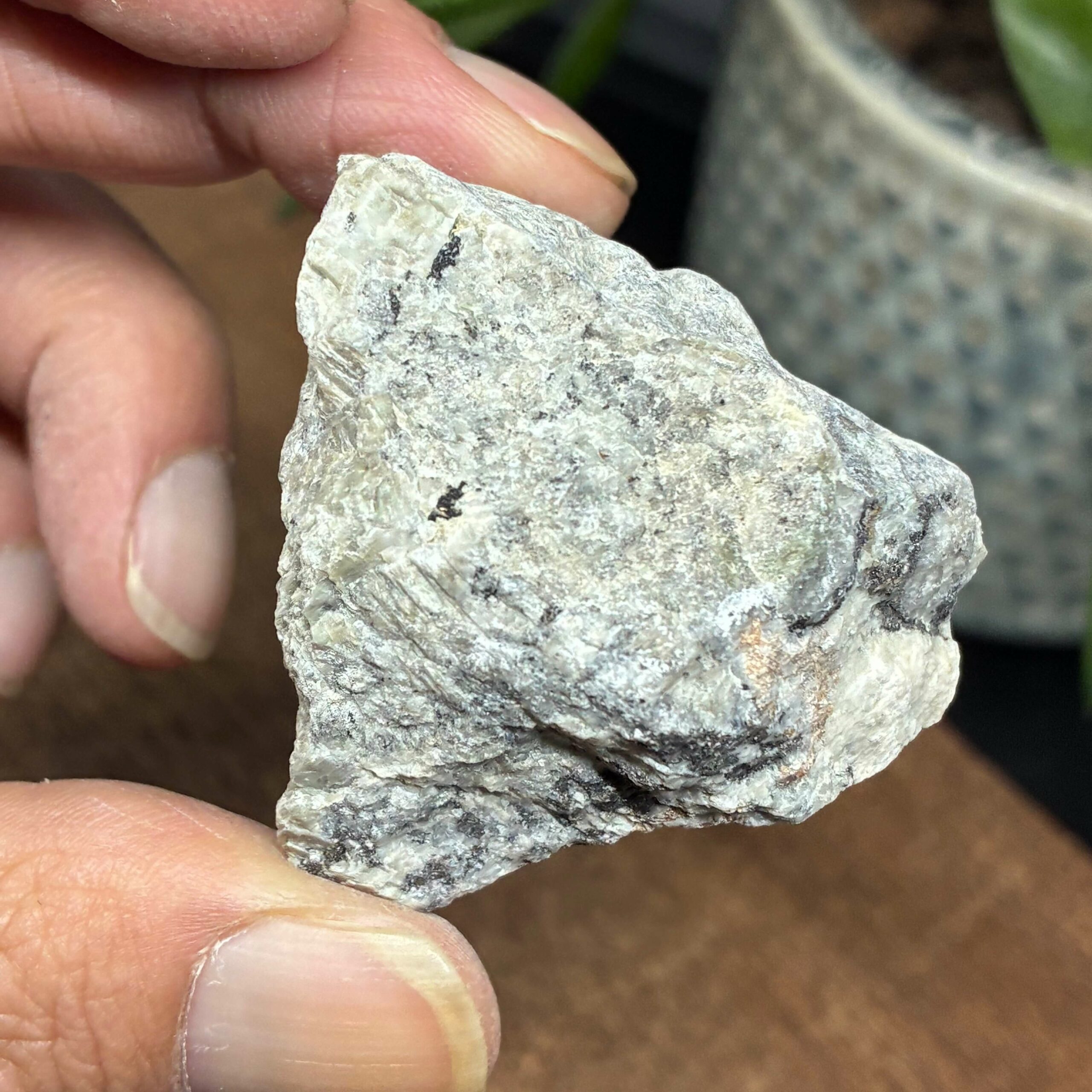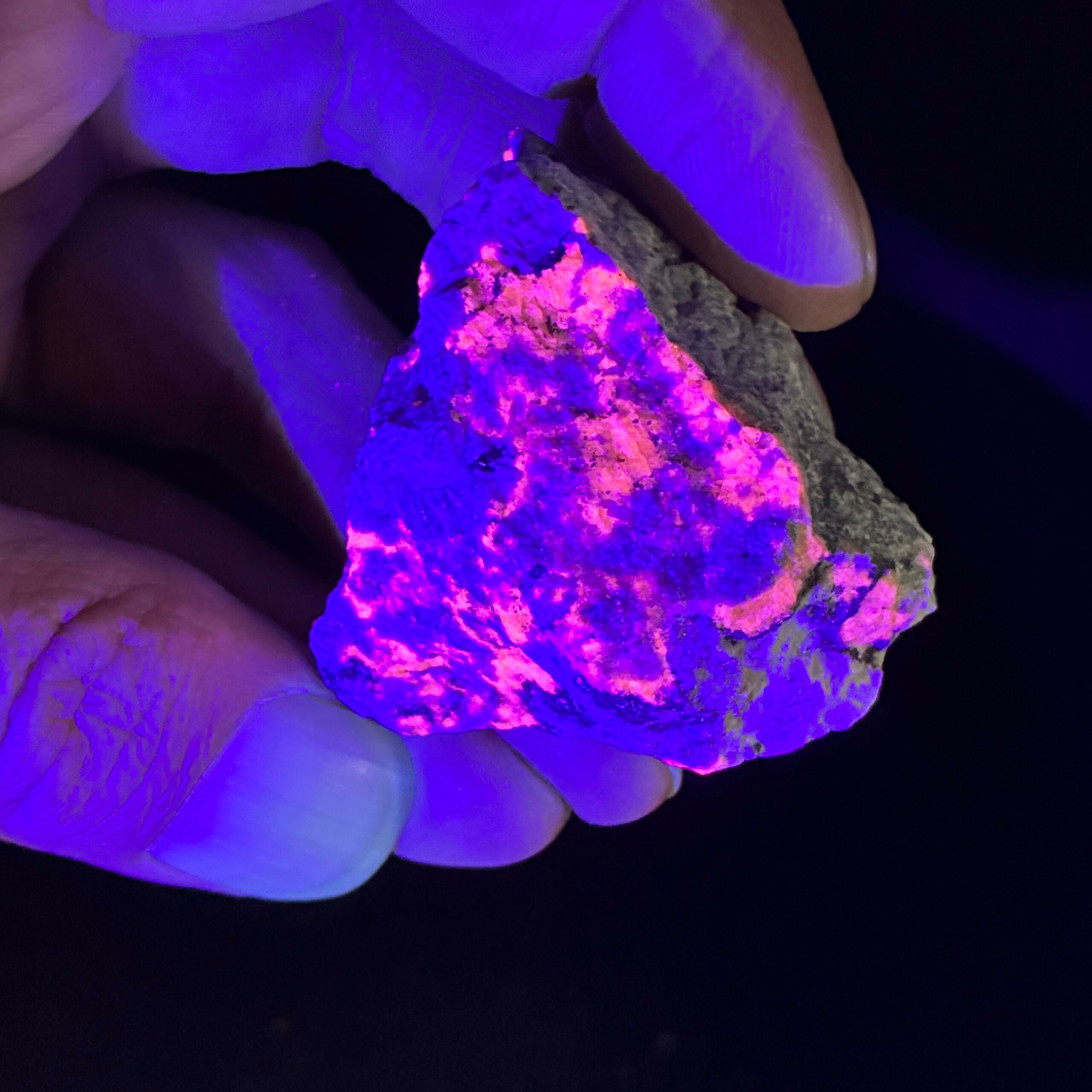 Den pensionerede Geolog fortalte mig at han går rundt i bække med gummistøvler/Waders og lyser ned i vandet med UV Lygten.. Når så det smukke fluoriserende farvespil dukker frem samler han stykket op.. Og vupti.. De stykker har vi nogle af her.
