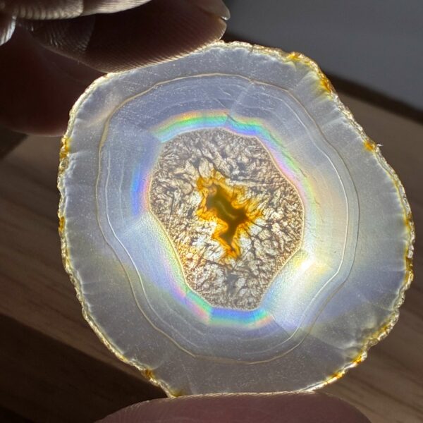 Iris agat er en Iriserende variant af agat hvor der viser en regnbue af farver når lyset trænger gennem.