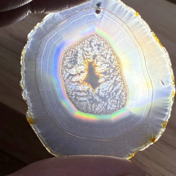 Iris agat er en Iriserende variant af agat hvor der viser en regnbue af farver når lyset trænger gennem.