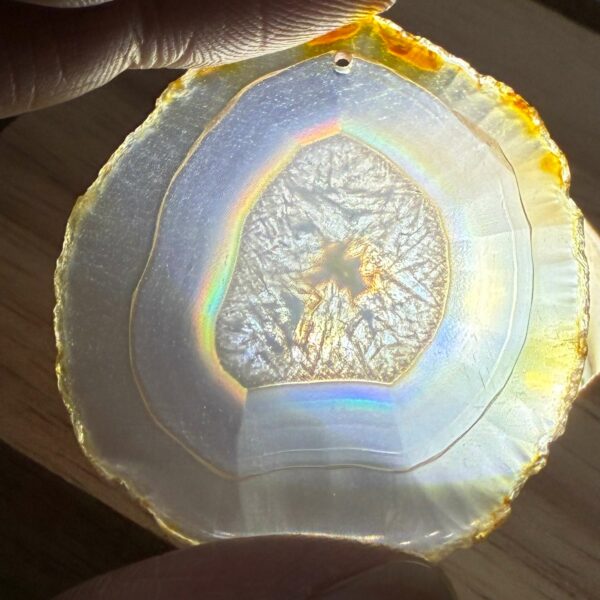 Iris agat er en Iriserende variant af agat hvor der viser en regnbue af farver når lyset trænger gennem.