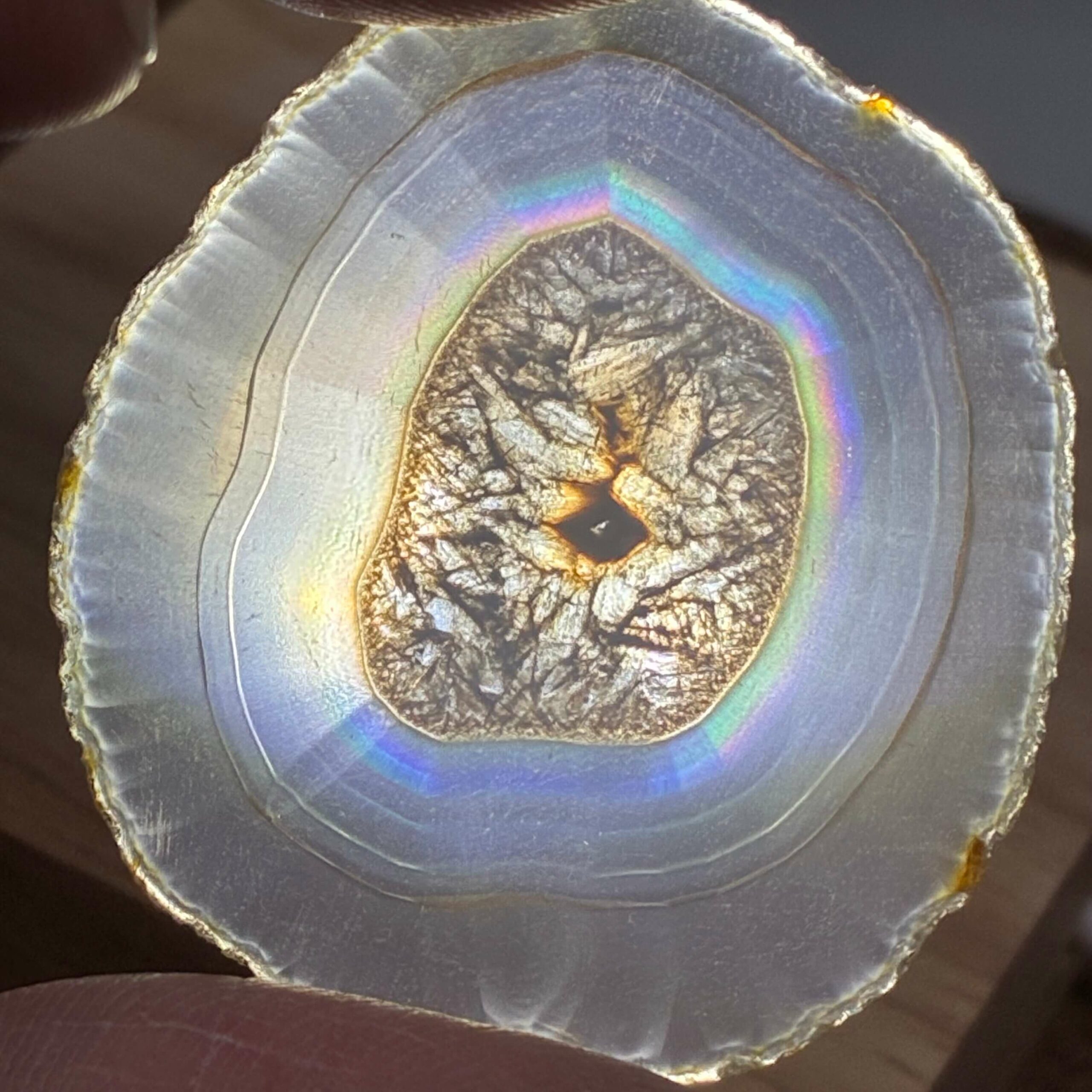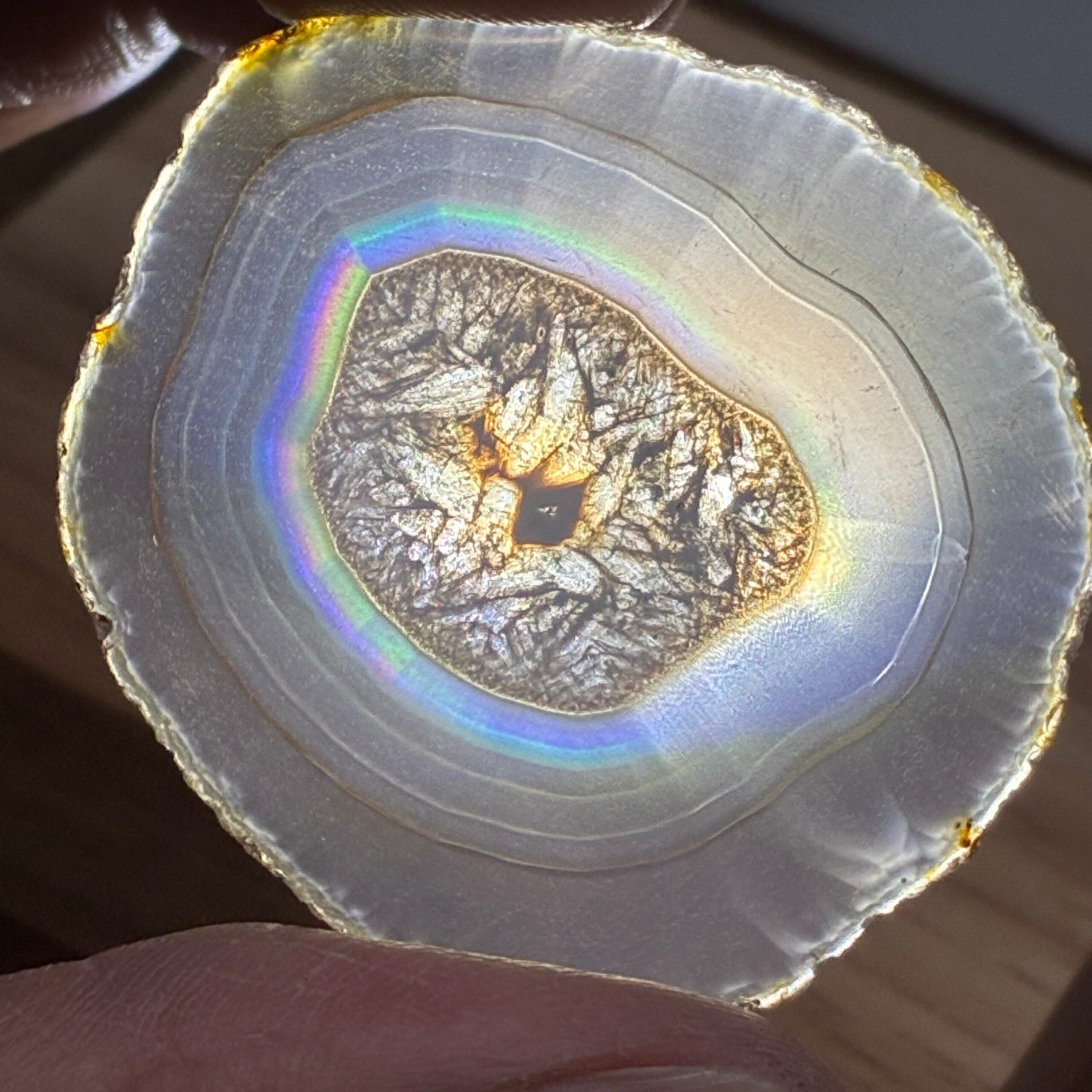 Iris agat er en Iriserende variant af agat hvor der viser en regnbue af farver når lyset trænger gennem.