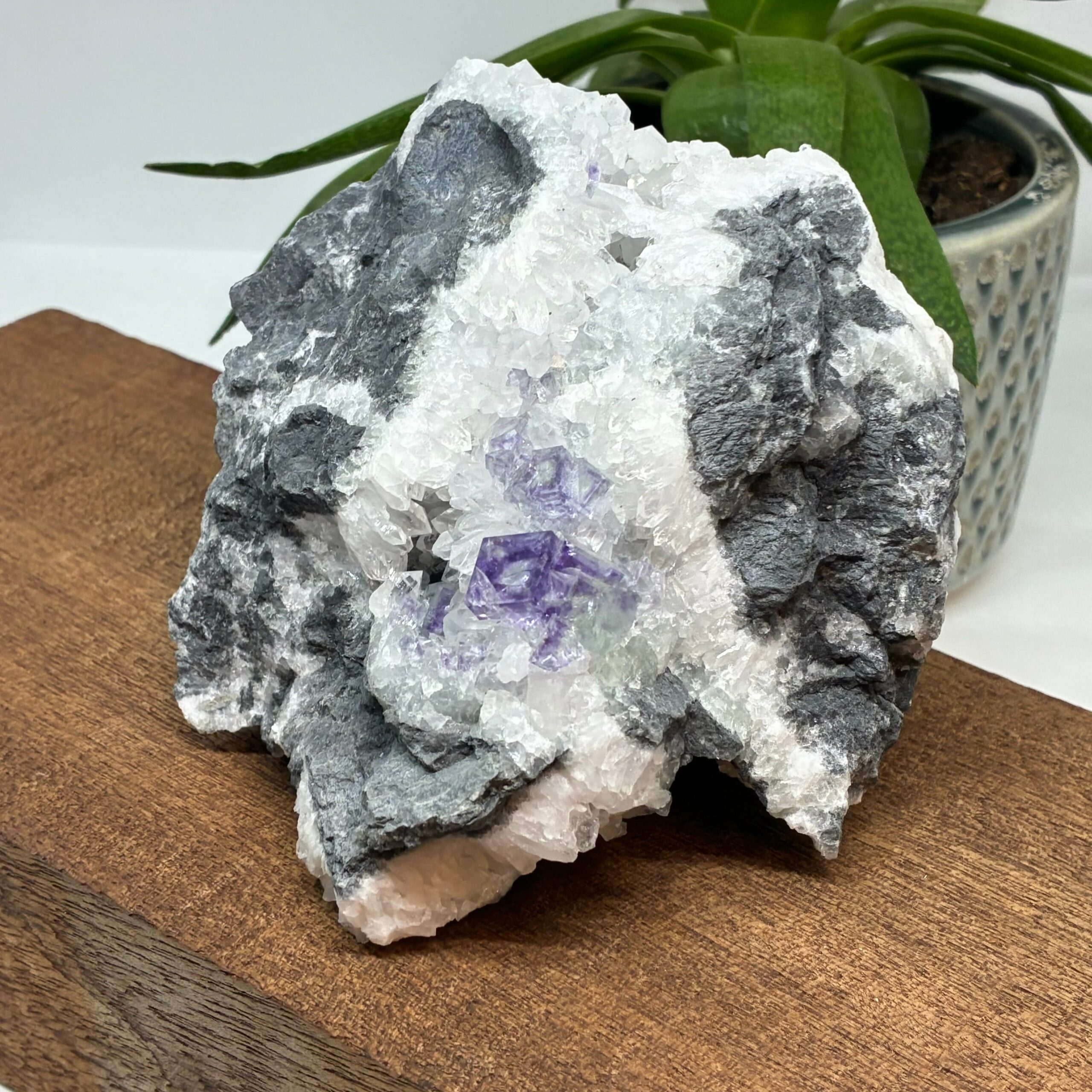 En calciumfluorit i kubiske formationer på matrix, med masser af kvarts krystalisering.