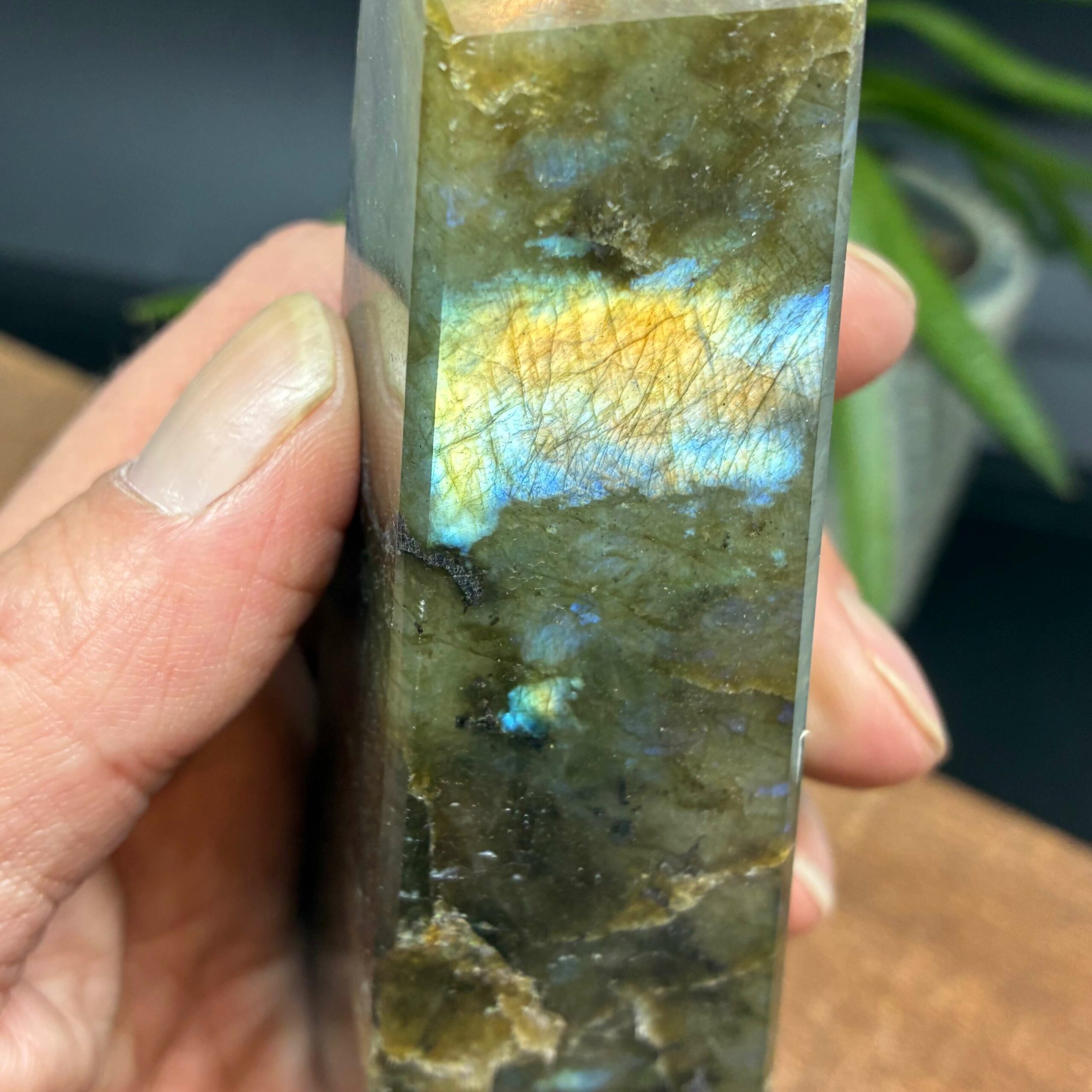 En plagioclas feldspat med spektralfarver.