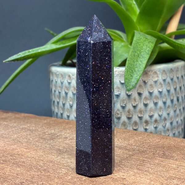 En fremstillet blå sten med glimmer.