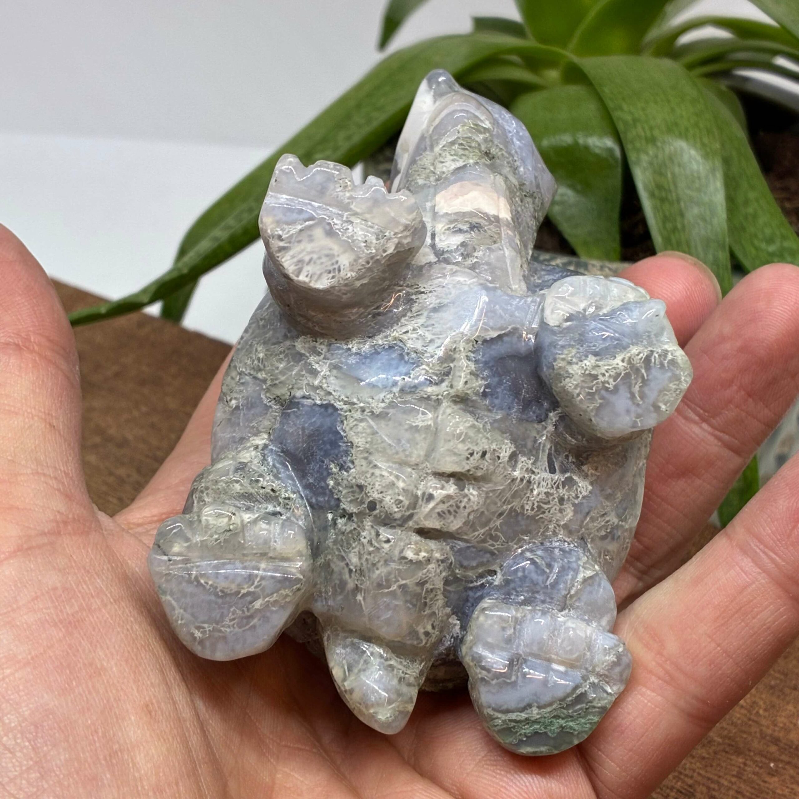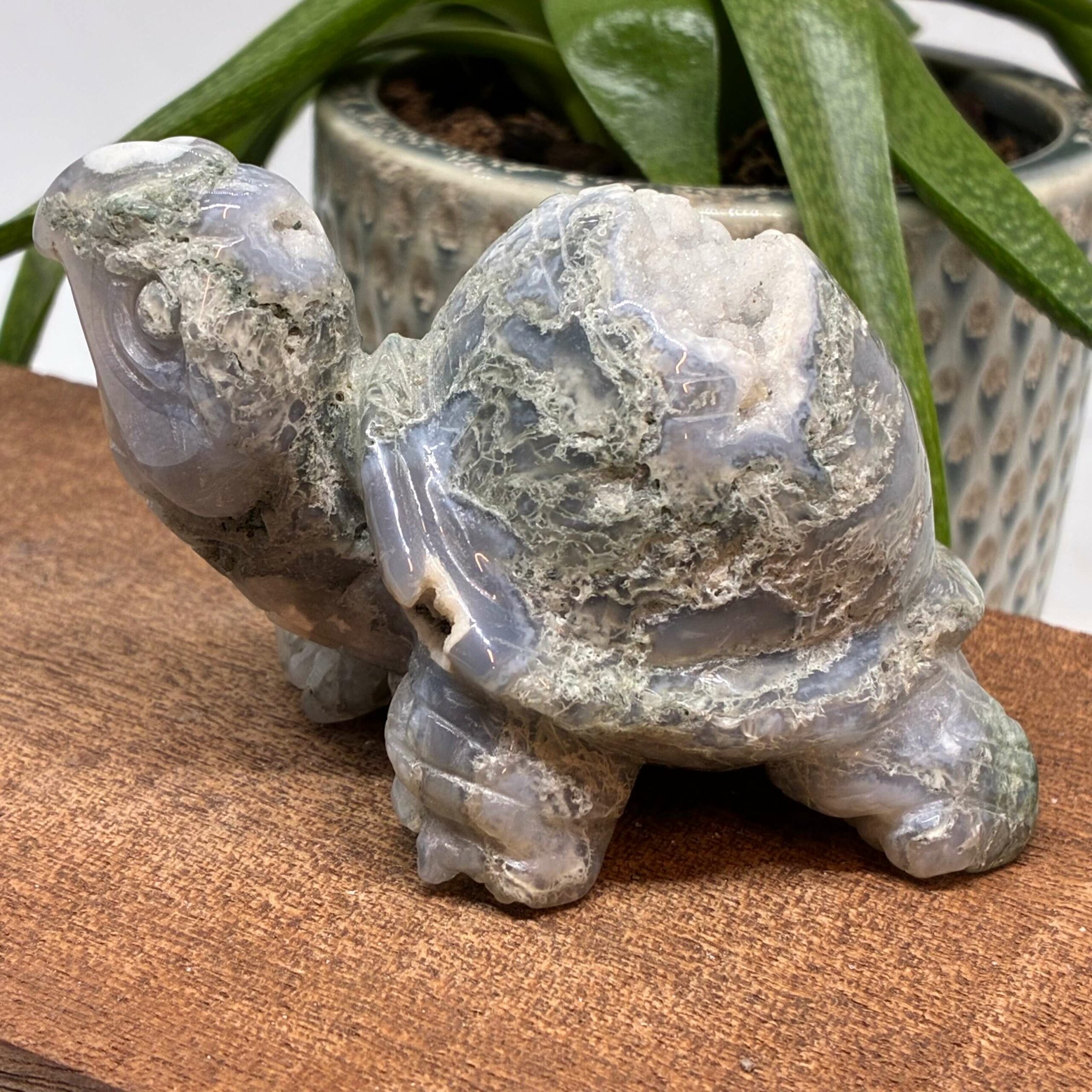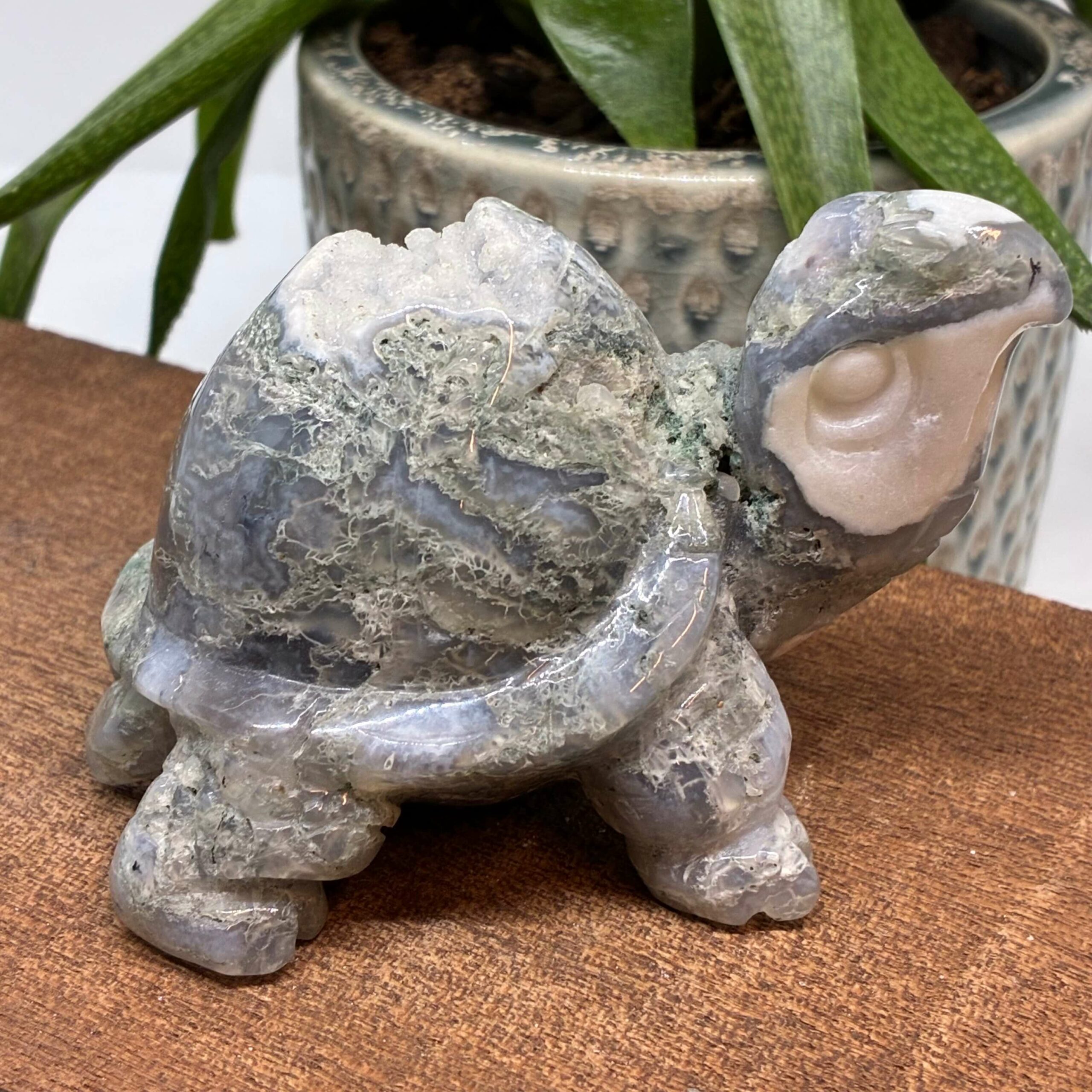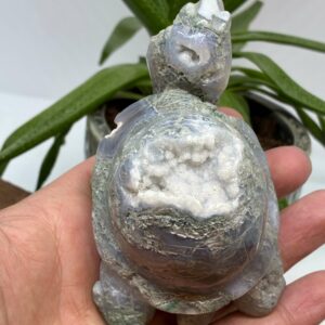 Smuk stor skildpadde skåret i Mos Agat, med flotte mosinklutioner og druzy.